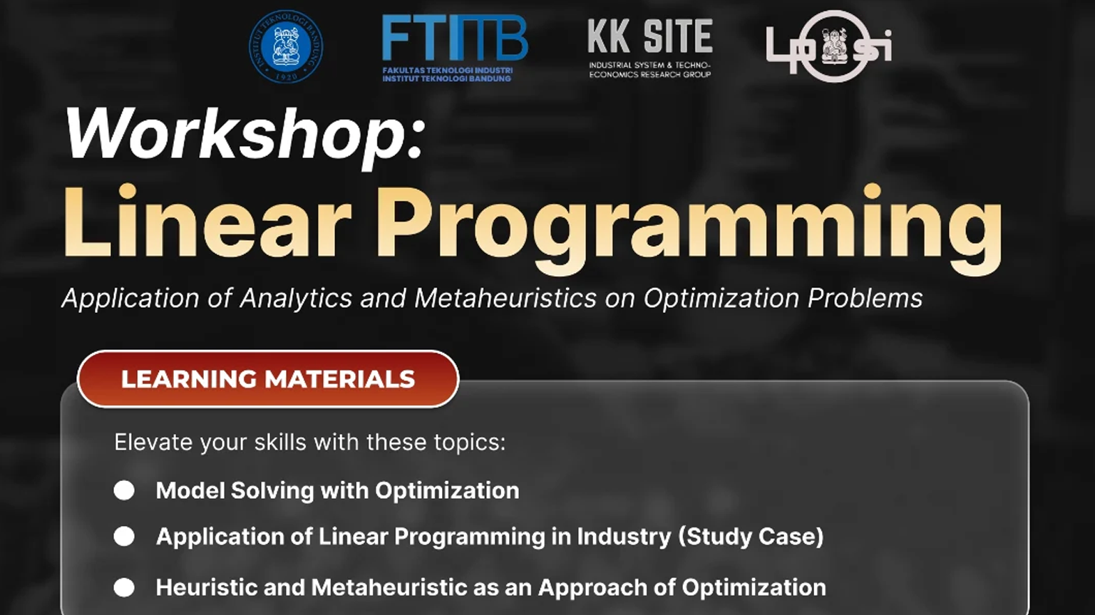 Laboratorium Perencanaan dan Optimasi Sistem Industri (LPOSI ITB), yang berada di bawah naungan Kelompok Keahlian Sistem Industri dan Tekno-Ekonomi (KK-SITE), Fakultas Teknologi Industri (FTI), Institut Teknologi Bandung (ITB), akan menyelenggarakan Workshop Linear Programming. Workshop ini dirancang untuk mahasiswa yang ingin memperdalam kemampuan dalam menggunakan Teknik Analitik dan Konsep Metaheuristik untuk menangani berbagai masalah optimisasi dalam […]